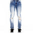 This light blue stretch punk super skinny style has a narrow leg from thigh to ankle. Crafted from a premium stretch denim then vintage washed with rips and repairs for a clean design. It features the cult signature selvedge trim details and XX" embroidery on the back leg. Utility belt included.