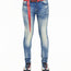 This medium blue stretch punk super skinny style has a narrow leg from thigh to ankle. Crafted from a premium stretch denim then vintage washed with contrast embroidery rips and repairs for a clean design. It features the cult signature selvedge trim details and XX" embroidery on the back leg. Utility belt included.