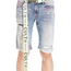 Slim-style shorts with a relaxed waist and a low rise. This light blue rocker slim short is crafted from premium denim and a neon color paint splatter and vintage wash to create a unique denim color combination. The leg narrows from the knee to the ankle.